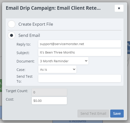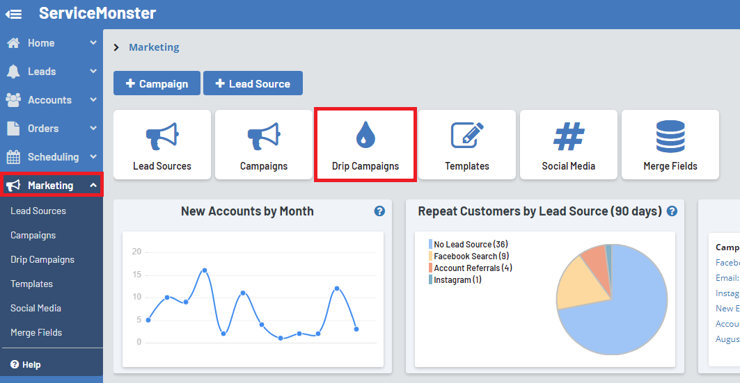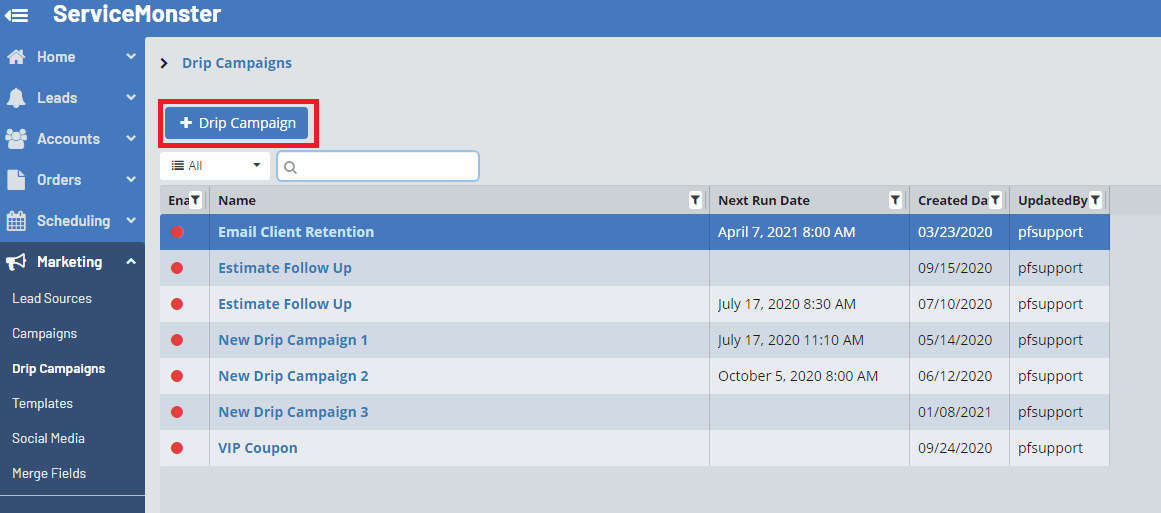 To create a drip campaign, go to the “Marketing” page using the left-hand side menu and select “Drip Campaigns”. This drip campaign can automate your communication with clients and remind them of the products and services you can offer them. It campaign works by sending out an email to your client based on the date that their last invoice was finished in the system. In order for this campaign to work efficiently, you will need to be actively completing your invoices in ServiceMonster. To follow up on your Estimates, click here to create an Estimate Campaign.