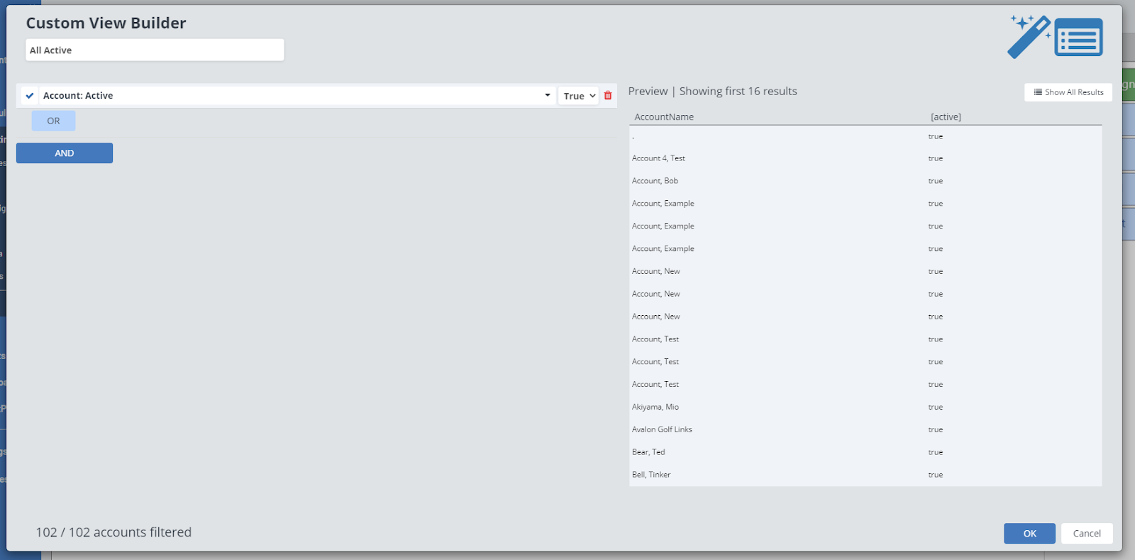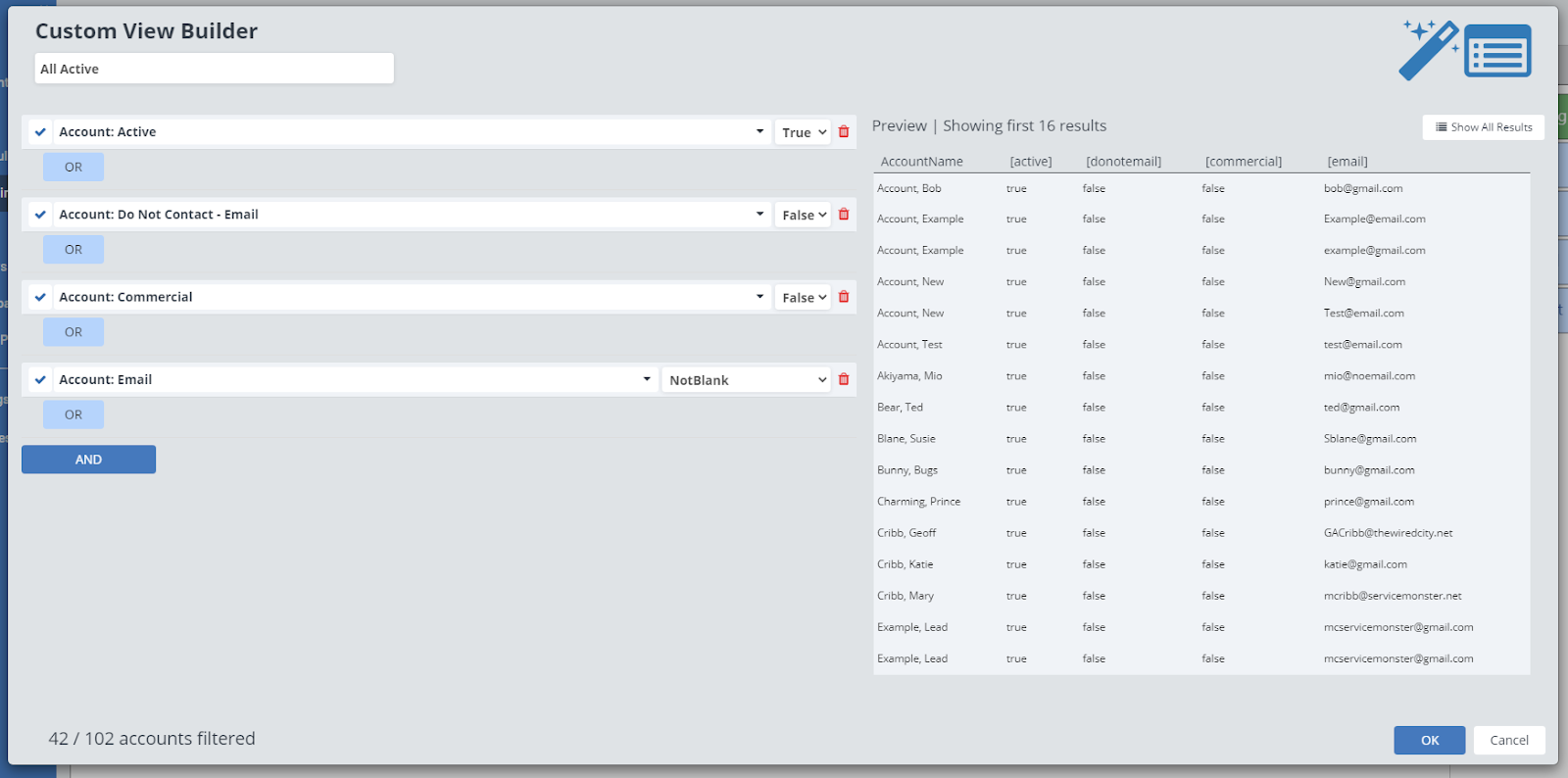 This will open up the custom view builder, on the left-hand side you will be able to view and edit the filters being applied, on the right you can see what accounts are being included in this campaign. (Click here to view a list of all the filters you can use on marketing campaigns)