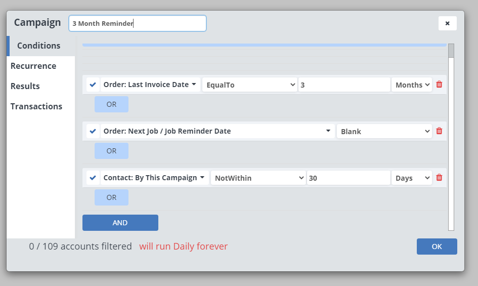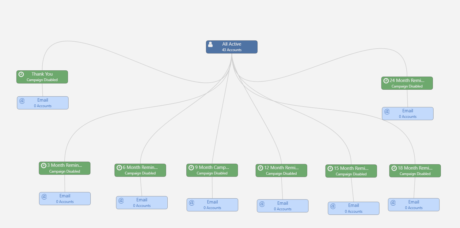 You can now go in and add as many campaign steps as you’d like! Use all the same conditions, and simply adjust the last invoice date filter to create emails that will send 6 months, 12 months, 15 months, ect after the last invoice in your clients account!