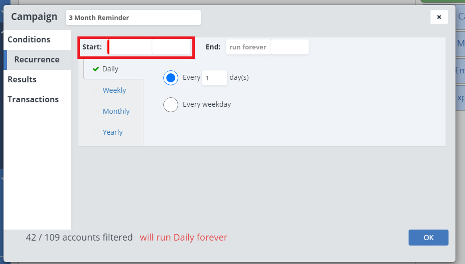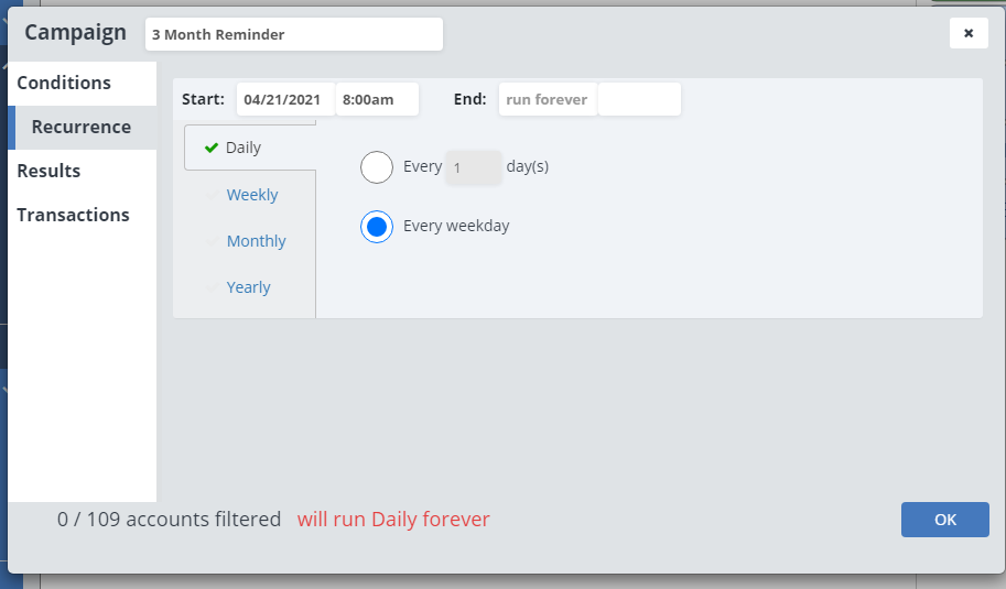 In the Recurrence Tab you can set how often this campaign will run. For the client retention campaign, you should set the campaign to run either every day or every work day for best results.
